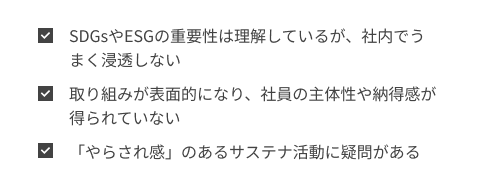 気候変動、資源枯渇、生物多様性の喪失、社会的分断やウェルビーイングの低下…… 地球規模の課題が、企業活動と日常のすぐ隣に存在する時代。もはや「サステナビリティに取り組まない」という選択肢はありません。 しかし現実には、以下のような悩みを抱える企業が多く存在します。